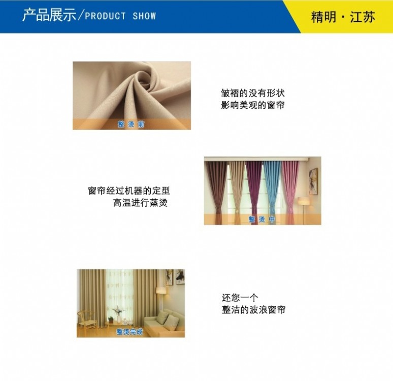 窗帘定型机中的窗帘是纺织品结构,定型之后的窗帘可以既可以减光、遮光,以适应人对光线不同强度的需求;又可以防风、除尘、防火、隔热、保暖、消声、防辐射,改善居室气候与环境。